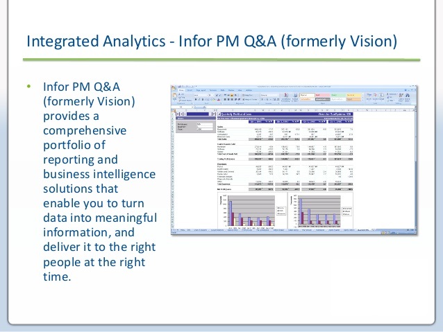 Infor Query & Analysis (aka Vision), is a set of business intelligence tools, delivering real time data and reporting proficiency.